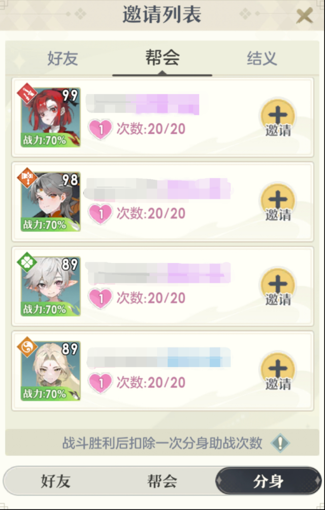 不過要注意,想要獲得更多星級,還是需要挑選一下分身的戰力和他們的契靈。只要不通關,分身的借用次數就不會消耗,雖然分身只能有本體的70%戰力(好友分身實力隨親密度增長而提升),但如果對方的本體實力極高,即使是70%也可以和自己的實力持平。因此,如果桃花師一時組不齊人,或是社恐不想和人一起打,都可以借用分身來幫打,分身會根據我們標記的指揮來行動,注意用好指揮功能就行。